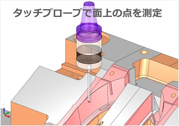 図では、測定点から面直方向の軸線上をタッチプローブの先端が通っています。